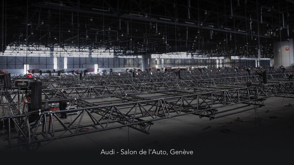 Pour ce 86e Salon International de l’Auto et des Accessoires, 96 moteurs reliés à un seul bouton ont été nécessaire pour lever l’imposant grill comprenant 4000m de tubes assemblés par nos riggers.