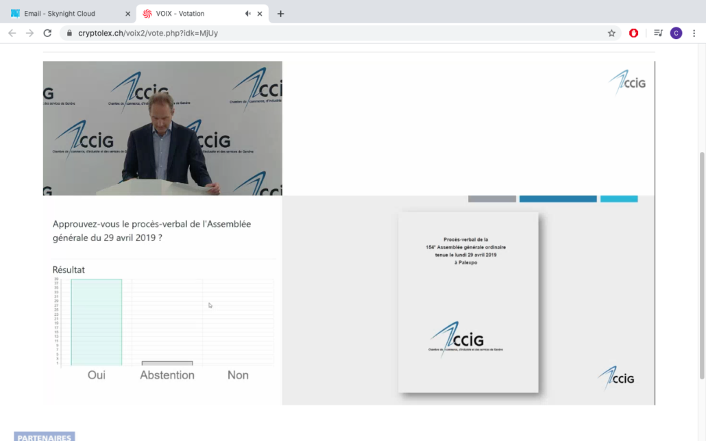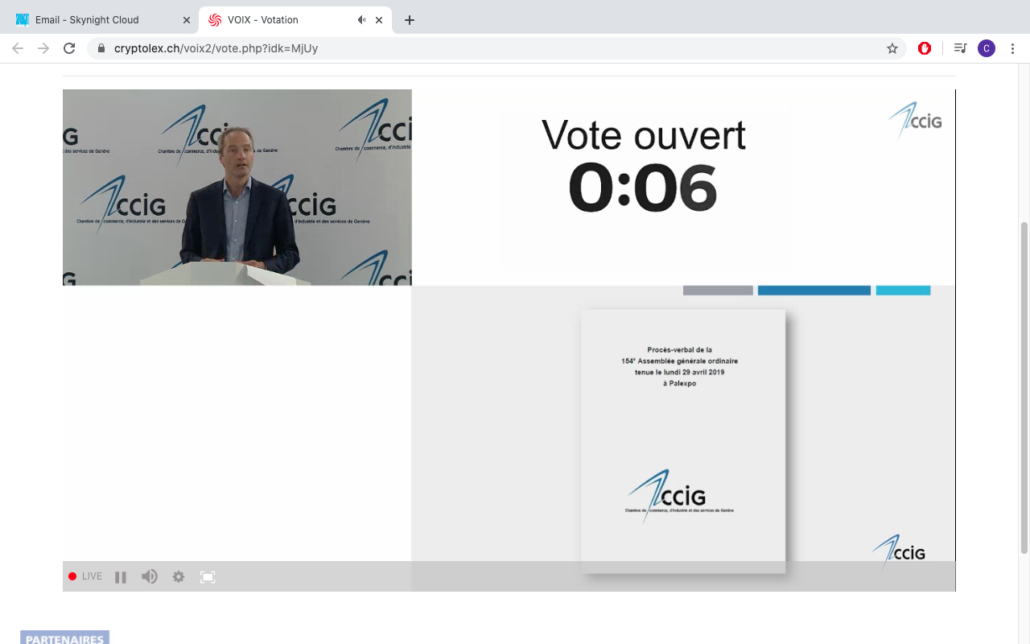 Vu le contexte de la crise sanitaire et l’impossibilité de réunir ses nombreux membres dans une même salle, la Chambre de Commerce, d’Industrie et des Services de Genève a décidé de maintenir son assemblée générale annuelle, mais de la présenter en restant à la pointe des technologies actuelles. Skynight a donc relevé le défi pour que tous les membres de la CCIG puissent se connecter sur internet en “live streaming” et participer aux différents votes de manière pleinement sécurisée, grâce aux solutions mises en place avec la société Cryptolex. Voici le résultat et le fonctionnement en images…